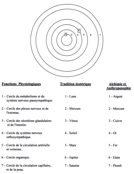 Cette hypothèse nous a conduit vers ceux qui avaient travaillé sur les correspondances planètes/métaux : les alchimistes du moyen âge (notamment Paracelse) et plus prés de nous R. Steiner au début du XXème siècle. Nous pouvons donc superposer le schéma suivant au précédent :