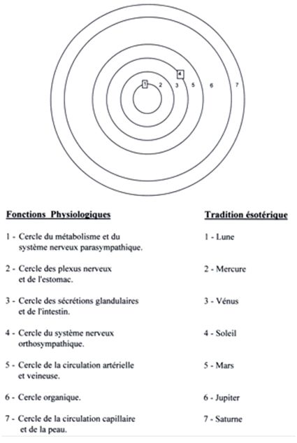 En observant les cercles physiologiques en iridologie et leur correspondance planétaire suggérée par l’ astrologie (schéma ci-dessous), nous avons pensé qu’une telle relation, si elle existait, devait mettre en jeu des supports permettant à ces phénomènes énergétiques et informationnels de circuler, de se propager et de se répondre du macrocosme (système solaire) au microcosme (humain).